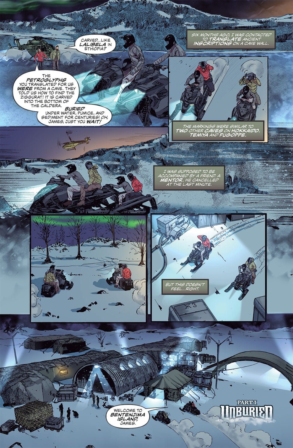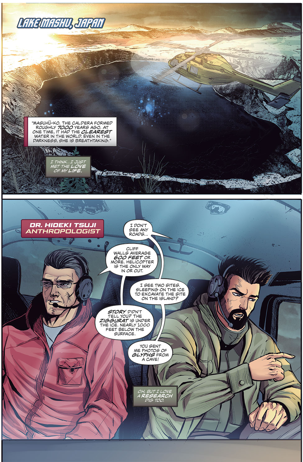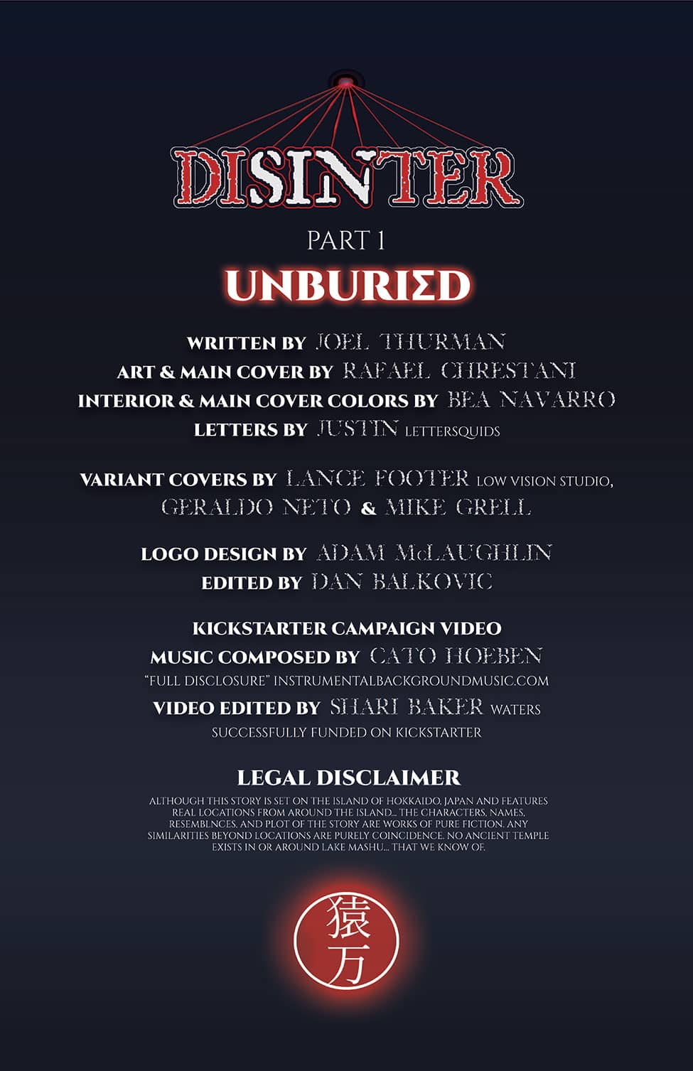 Disinter is an archeology themed horror story set in Hokkaido, Japan. Issue 2 (28 pages, fully colored) helps to uncover the mystery of the demigod Kimaris and those who want to resurrect the demon. Enter the “World of Disinter,” a modern mythological epic. Disinter is written by Joel Thurman. Drawn by Rafael Chrestani. Colored by Bea Navarro. Lettered by Lettersquids. And printed by Comix Wellspring after a fully funded Kickstarter campaign.